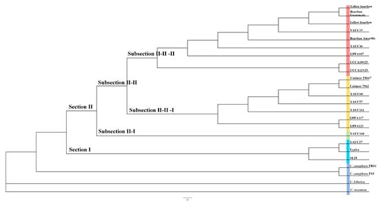 A phylogenetic tree containing 20 C. arabica accessions was constructed using the neighbor-joining algorithm in MEGA X, with two C. canephora accessions, one C. liberica accession, and one C. racemosa accession serving as the outgroup. The cluster analysis revealed two C. arabica sections (Figure 1), with three accessions in section I and 17 accessions in section II. Section I consisted of two commercial cultivars (SL28 and Typica) and one local selection (YAUC37). Of the two commercial cultivars, Typica is a well-known C. arabica Typica-type variety. Section II, which comprised 11 commercial cultivars and six local selections, was separated into subsections. Subsection II-I included one local selection (YAUC160), whereas Subsection II-II contained 11 commercial cultivars and five local selections. Furthermore, Subsection II-II was divided into two subsections, with Subsection II-II-I consisting of four commercial cultivars and three local selections. Two of the commercial cultivars (Catimor T8667 and Catimor 7963) produce high yields and are resistant to rust, which may help to explain why they are commonly cultivated worldwide. The other two commercial cultivars (GPFA117 and GPFA121) were imported to Yunnan, China by Nestle (Tours, France). Subsection II-II-II comprised seven commercial cultivars and two local selections. Of the seven commercial cultivars, Bourbon Guatemala and Bourbon Amarillo are well-known C. arabica Bourbon-type varieties, whereas two Yellow Bourbon commercial cultivars are well-known C. arabica Bourbon-type hybrids. The remaining three commercial cultivars (GPFA107, CCCA10×25, and CCCA12×25) were also introduced to Yunnan, China by Nestle.