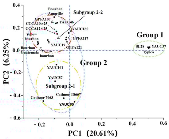 A PCA was performed to verify the clustering of the 20 C. arabica accessions (Figure 2). Principal components 1 and 2 (i.e., PC1 and PC2) explained approximately 26.86% of the total variation (20.61% and 6.25%, respectively). In addition, PC1 clearly distinguished the accessions in Group 1 from the other accessions. Moreover, PC2 separated Subgroup 2-1 from Subgroup 2-2. The clustering of some accessions in Group 1 and Subgroup 2-2 reflected the relatively close genetic relationships between the germplasm resources. In contrast, the five accessions in Subgroup 2-1 were scattered in the PCA plot, indicative of relatively distant genetic relationships among the various germplasm resources.
