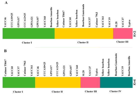 In the model-based analysis of the 20 C. arabica accessions (Figure 3), STRUCTURE revealed that the optimal number of groups (K) was three (Figure S2). The model with K = 3 grouped SL28, Typica, and YAUC37 into Cluster III. In addition, Cluster I was composed of two local selections and six commercial cultivars, including Bourbon-2 and five commercial cultivars bred by Nestle. Cluster II, which consisted of five commercial cultivars and four local selections, included Bourbon Guatemala, two Yellow Bourbon commercial cultivars, Catimor T8667, and Catimor 7963. For the model with K = 4, SL28, Typica, and YAUC37 were still clustered in Cluster III. Catimor T8667 and Catimor 7963 and three local selections were classified in Cluster I, whereas five commercial cultivars bred by Nestle and two local selections were grouped in Cluster II. Cluster IV included Bourbon Guatemala, Bourbon Amarillo, two Yellow Bourbon commercial cultivars, and one local selection.