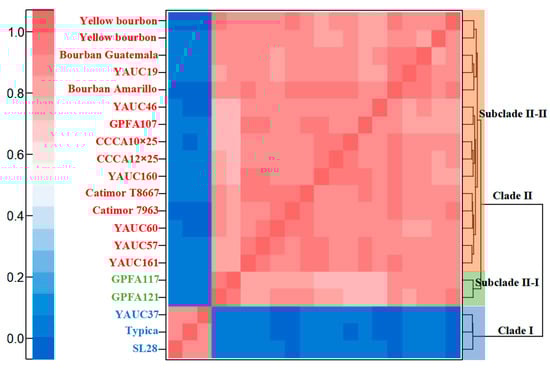 The correlation analysis indicated that the 20 C. arabica accessions were clustered in two clades (Figure 4). Three accessions (SL28, Typica, and YAUC37) belonged to clade I and 17 accessions were included in clade II. There were strong positive correlations among SL28, Typica, and YAUC37 (r = 0.892–0.9089) (Table S3). Clade II was clearly separated into subclades. Two commercial cultivars (GPFA117 and GPFA121) in Subclade II-I were imported to Yunnan, China by Nestle. There was a strong positive correlation between these two commercial cultivars (r = 0.9362). Subclade II-II contained the remaining 15 C. arabica accessions. The Bourbon Guatemala, Bourbon Amarillo, two Yellow Bourbon commercial cultivars, Catimor T8667, and Catimor 7963, were clustered in Subclade II-II. The correlation coefficients for the 20 C. arabica accessions (based on gene expression levels determined by the transcriptome analysis) are listed in Table S3.