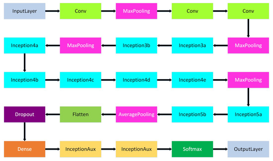 - Szegedy, C.; Liu, W.; Jia, Y.; Sermanet, P.; Reed, S.; Anguelov, D.; Erhan, D.; Vanhoucke, V.; Rabinovich, A. Going deeper with convolutions. In Proceedings of the IEEE Conference on Computer Vision and Pattern Recognition, Boston, MA, USA, 7–12 June 2015; pp. 1–9. [Google Scholar]