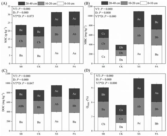 Changes in SOC (A), MBC (B), and DOC (C) content and QMBC (D) in the 0–40 cm soil layers under different vegetation restoration types. Notes: SB—Stipa bungeana Trin.; CK—Caragana korshinskii Kom.; XS—Xanthoceras sorbifolia Bunge.; PA—Picea asperata Mast. VT and D denote the type of vegetation restoration and depth of the soil layer, respectively. The error bar is the standard error. Different uppercase letters indicate significant differences between different vegetation restoration types in the same soil layer, and different lowercase letters indicate significant differences between different soil layers of the same vegetation restoration type (p < 0.05, according to LSD ANOVA test).