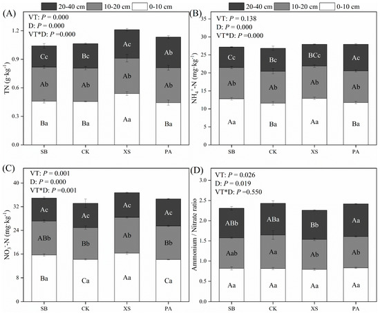 Changes in soil TN (A), NH4+-N (B), and NO3−-N (C) content and ammonium/nitrate ratio (D) under different vegetation restoration types. Notes: SB—Stipa bungeana Trin.; CK—Caragana korshinskii Kom.; XS—Xanthoceras sorbifolia Bunge.; PA—Picea asperata Mast. VT and D denote the type of vegetation restoration and depth of the soil layer, respectively. The error bar is the standard error. Different uppercase letters indicate significant differences between different vegetation restoration types in the same soil layer, and different lowercase letters indicate significant differences between different soil layers of the same vegetation restoration type (p < 0.05, according to LSD ANOVA test).