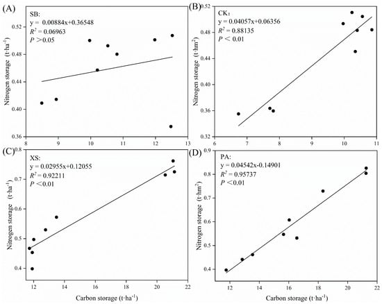 Relationship between soil carbon storage and nitrogen storage in 0–40 cm under different vegetation restoration types (A–D). Notes: SB—Stipa bungeana Trin. (A); CK—Caragana korshinskii Kom. (B); XS—Xanthoceras sorbifolia Bunge. (C); PA—Picea asperata Mast. (D).