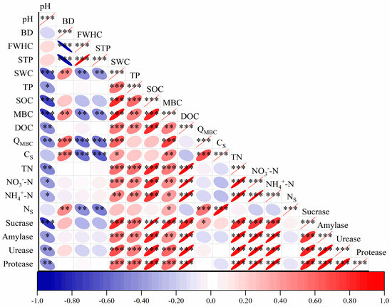 Correlation analysis between soil carbon/nitrogen and soil environmental factors. Notes: *, **, and *** are significantly correlated at p < 0.05, p < 0.01, and p < 0.001 levels (bilateral), respectively. BD—bulk density; FWHC—field water holding capacity; STP—soil total porosity; SWC—soil water content; TP—total phosphorus; SOC—soil organic carbon; MBC—microbial biomass carbon; DOC—dissolved organic carbon; QMBC—microbial efficiency quotient; CS—carbon storage; TN—total nitrogen; NH4+-N—ammonium nitrogen; NO3−-N—nitrate nitrogen; NS—nitrogen storage.