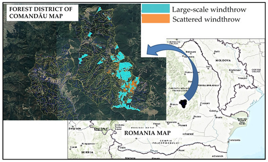 Windthrow produced in the Forest District of Comandău was studied before the phenomenon analysed in this paper, especially after the large-scale windthrow produced on the 5th and 6th of November, 1995 and the endemic windthrow from 2000 to 2009 [26,30,31,32,33,34,35]. In November 1995, the area administered by Covasna County Forest Administration was affected by windthrow on an plot of 23,293 hectares and a volume of 2.649 million m3 was damaged [36]. In the Forest District of Comandău, an area of approximately 9000 hectares was affected, resulting in a volume loss of 1.100 million m3. Referring to the same period of time, in [34], it is stated that the total surface affected in the Covasna County Forest Administration was of 33,225.5 hectares, resulting in a volume loss of 2.704 million m3. In the archives of the Forest District of Comandău [37], it is mentioned that on the 1st of January 1996 (about two months after the windthrow from the 5th and 6th of November 1995), this phenomenon took place in all management units (eight in number). A total surface of 3884.70 hectares was affected and a volume of 605,790 m3 was damaged.