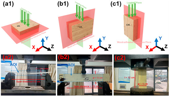 Three loading regimes, i.e., flat-wise bending (a1), edge-wise bending (b1), and axial compression (c1), that apply to the characterization of the creep behaviors of LVL are indicated in an X-Y-Z coordinate system. The loading direction is also pinpointed using green arrows. The spatial positions of the wood–adhesive interface and loading plane are indicated. Corresponding photos of creep tests are presented in (a2–c2), respectively, yielding a span-distance of 25 cm and the area of interest for strain analysis.