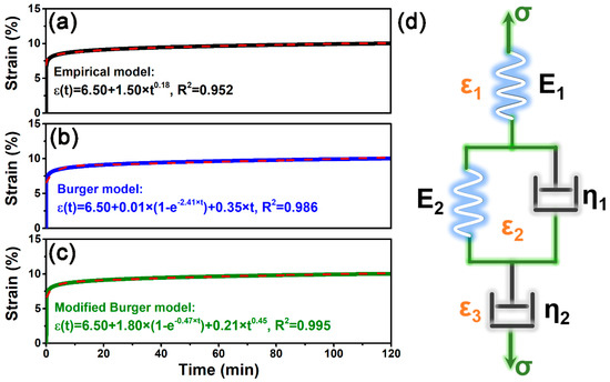 In order to further improve the creep fitting accuracy of the viscosity stage of LVL, we transformed the linear term (t) in the Burgers model into a power one (tm), as displayed in Equation (7). The coefficient m exhibits no physical significance, and it was only used to transform the viscous phase from a linear function to a nonlinear one, which is more consistent with the whole process of the creep deformation of wood [34]. As displayed in Figure 2c, creep curve fitting achieves higher accuracy compared with the former analysis, with R2 up to 0.995. Therefore, the modified Burgers model was selected to fit the creep curves in this study.