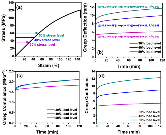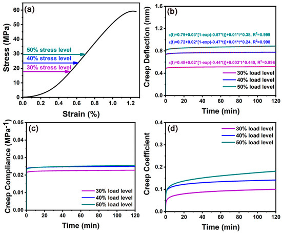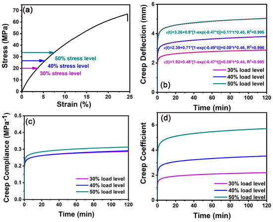The stress−strain (a), creep deflection−time (b), creep compliance−time (c), and creep coefficient−time (d) curves of the flat-wise bent LVL. The data presented in (a) were averaged from six replicates.