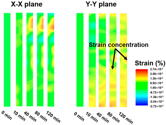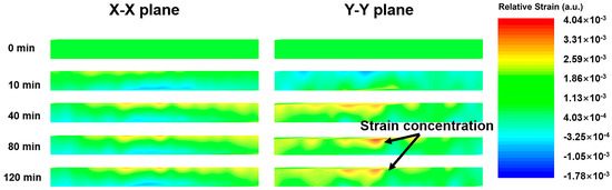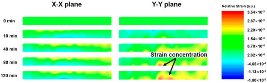 Figure 8 shows the creep strain dissipation of LVL under 50% of the ultimate strength when subjected to axial compression creep. Compared with the bending creep (i.e., flat-wise and edge-wise), the axial compression creep of LVL exhibited a completely different stress/strain distribution. Creep strain accumulation along the X-X plane can be observed in the top half region of the LVL as the time exceeds 40 min. The highest creep strain was observed to be 2.7 × 10−3 in the X-X plane, indicating the obvious expansion of the LVL. Despite this, creep strain dissipation was demonstrated to be more obvious in Y-Y plane (i.e., being parallel to the wood–adhesive interface), indicating the dominance of Y-Y plane in creep strain dissipation. The strain concentration can be observed to be situated in the bottom half of the LVL.