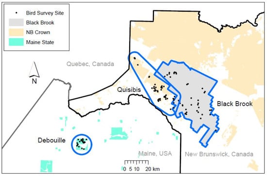 Study areas. The three landscapes, Black Brook (BBRO), Quisibis (QUIS) and Debouille (DEBU), blue polygons, are all located within 100 km of each other in the province of New Brunswick, Canada, and the state of Maine, United States of America. QUIS polygon was drawn using a fixed-width buffer, creating an artificial overlap with BBRO. Bird survey sites located within the BBRO polygon contributed only to the BBRO data.