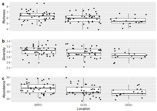 A one-way ANOVA revealed that there was a statistically significant difference in the richness index, Shannon diversity and abundance between the landscapes (Table 4). Tukey’s HSD test for multiple comparisons supported that these differences are primarily between the BBRO and DEBU landscapes, with BBRO having higher richness, diversity and abundance (Table 3 and Table 4 and Figure 2). The data met the assumptions of normality, homoscedasticity of variance (assessed through visual examination of data) and independence (observations were spaced to maintain independence).