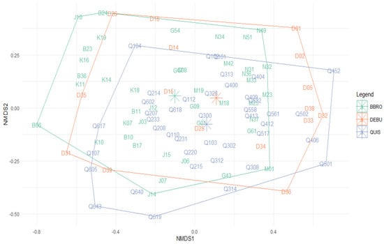 The non-metric multidimensional scaling (NMDS) results point to considerable overlap between landscape polygons, suggesting limited differences in bird community composition between the selected stands of landscapes (Figure 3). The Permanova test showed a significant difference at p < 0.05 for the comparison of BBRO with QUIS and DEBU but with very little variance explained. The beta dispersion paired comparisons showed no significant differences in community variance between BBRO and other landscapes (Table 5), suggesting that the variance between landscapes is homogeneous and, therefore, that the comparison of centroids is robust.