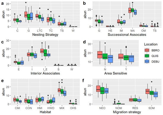 Comparison of landscapes according to functional traits for abundance (abun). Functional classifications include (a) nesting strategy: C = cavity, G = ground, LTC = lower tree canopy, TC = tree canopy, TS = tall shrubs and W = wetland; (b) successional associates: G = generalist, HE = herbs, IM = immature, MA = mature, OM = overmature and TS = tall shrubs; (c) interior associates: E = edge, I = interior, I_E = both, S = shore and W = wetland; (d) area sensitive: Y = yes and N = no; (e) habitat: CMI = conifer mixedwood, CON = conifer, HMI = hardwood mixedwood, HWD = hardwood, MIX = mixedwood and OHS = open herb and shrub; (f) migration strategy: NEO = neotropical migrant, NOM = nomadic, RES = resident and SDM = short-distance migrant. Box and whisker plots display quartiles and median values.
