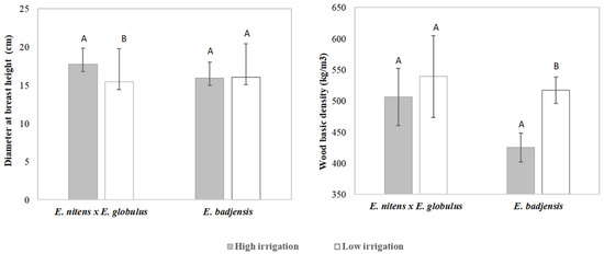 Pearson correlations between DBH (cm) and WBD (kg m−3) for E. nitens × E. globulus hybrids growing under low irrigation was −0.713 (p < 0.05) and under high irrigation was −0.041 (p > 0.05). For E. badjensis, the same correlations were −0.967 (p < 0.05) under low and −0.127 (p > 0.05) under high irrigation.