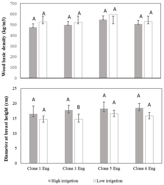 Wood basic density (WBD, kg m−3) and diameter at breast height (DBH, cm) for the five hybrid E. nitens × E. globulus clones in low and in high irrigation. Different letters (A,B) indicate statistical difference between high irrigation and low irrigation (p < 0.05).