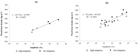 A positive correlation was observed between wood basic density (kg m−3) and mean amplitude (%) for all genotypes, where the Pearson correlation coefficient for E. nitens × E. globulus was 0.84 (p < 0.05) and for E. badjensis, 0.97 (p < 0.05). In the case of E. badjendsis, the amplitude values were strongly affected by irrigation conditions (Figure 4). Contrastingly, the E. nitens × E. globulus hybrids’ amplitude values were not related to irrigation conditions.