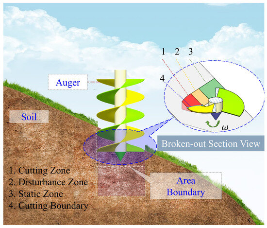 According to the pre-experiment, the soil involved at an instantaneous moment during digging can be divided into three areas before analysis, which were the cutting zone, the disturbance zone, and the static zone, as shown in Figure 1. The cutting area is where the soil is just cut off by the spiral blade and is away from its original position. The disturbance zone is where the soil has yet to be touched by the spiral blade, but it has been loosened due to the pressure disturbance from the lower end of the spiral blade and the soil in the cutting zone. The static zone refers to the area where the soil is still in its original position, not in contact with the spiral blade.