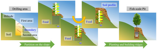 Many of the forestry regions planned for development are located in arid and semi-arid hilly areas. The ecology of these regions is delicate and the terrain is complex. Working conditions in hilly and mountainous regions are challenging due to the high mountains and steep slopes [2]. In practical production, workers use manual tools such as shovels and pickaxes for digging or attach tools like augers, buckets, and plows to construction machinery or tractors for operations. In areas with complex terrain, especially those difficult for construction machinery to reach, aerial afforestation methods involving aircraft are employed. While this approach enhances afforestation efficiency, it exhibits better adaptability to seeds than seedlings. However, it relies significantly on uncontrollable factors such as wind, light exposure, soil solidity, and planting depth. Among these methods, the use of augers is more widespread due to their portability, high efficiency, precise operational positioning, and minimal surface disruption. Additionally, operations in arid and semi-arid hilly areas require conservation measures for water and soil. A semi-moon-shaped fish-scale pit ground preparation operation is necessary to store water and prevent runoff, effectively reducing soil erosion. However, this process is inefficient, cumbersome, and difficult to mechanize [3,4,5].
