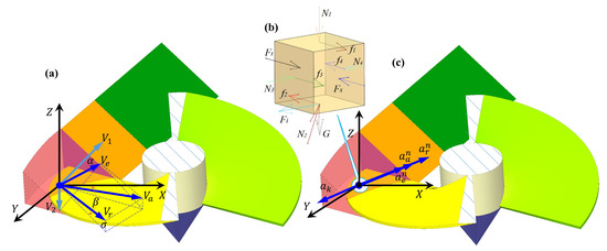 Figure 3c is the acceleration analysis diagram of the soil particles, and Equation (4) is formed based on the acceleration composition theorem, where is the absolute acceleration, and the direction and size are unknown. is the tangential acceleration of the implicated motion. Because the dig velocity is fixed, the angular acceleration is 0. The value of is 0. Similarly, the value of the relative velocity tangential acceleration () is 0. is the normal acceleration of the implicated motion, and it points towards the center of rotation. is the normal acceleration of the relative velocity, and it points towards the center of curvature of the spiral. is the Coriolis acceleration, and its direction is opposite to . The value of various accelerations can be expressed as Equation (5). To describe the forces in the digging process more accurately, the particle was regarded as a block in the analysis, as shown in Figure 3b. In this way, the particle contains six surfaces, which can facilitate the analysis of the force in various directions. The dynamic analysis of the digging process can be expressed as Equation (6).