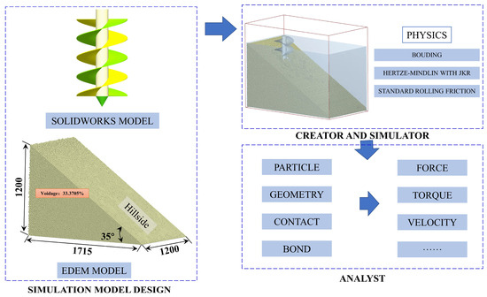 DEM simulations were run using the EDEM software. The EDEM software was installed on a computer with an Intel (R) Core (TM) i7-8700 CPU @ 3.20 GHz with 32 GB of RAM. The virtual simulation method and process are illustrated in Figure 4.