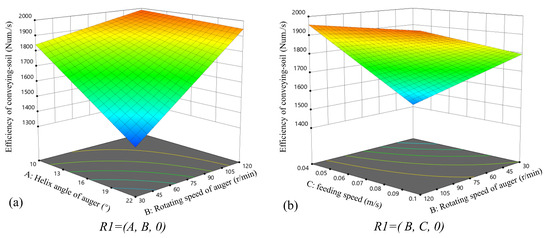 In addition, there are interactions between the helix angle of the auger and the rotating speed of the auger, as well as between the feeding speed and rotating speed of the auger, on the efficiency of conveying soil (R1). The fitting coefficient of the efficiency of conveying soil is R2 = 0.9092. The p-value of the model for the efficiency of conveying soil is <0.1. The fitting coefficient of the distance of throwing soil is R2 = 0.9399. The p-value of the model for the distance of throwing soil is <0.1. It is indicated that the response surfaces of the two models established have good consistency and predictability for the experimental results. To express the interactive influence of each factor on the efficiency of conveying soil (R1), another factor was set to level 0, while the other two underwent an interaction effect analysis to study their influence on evaluation index R1, and the corresponding response surfaces were generated, as illustrated in Figure 5.