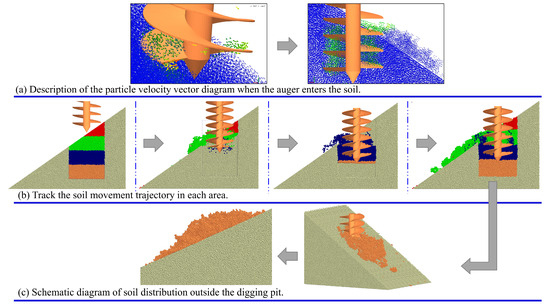 Due to the influence of the slope, the two spiral blades that feed in the vertical direction alternately cut the soil in the first zone (soil on the high-altitude side). Then, the soil moves uplift along the surface of the spiral blades. The soil in this area continues to be tracked. When the lower end of a spiral blade leaves the soil, turns to the low altitude area, and disposes of the obstruction of the pit wall, the soil will be thrown to the outside or slide down along the surface of the spiral blade, as shown in Figure 6a,b. According to the analysis of centrifugal force (Equation (7)), when it comes to augers of the same specification, the throwing radius is mainly determined by the angular velocity of the auger. In the case of a lower rotation speed, when the centrifugal force cannot overcome the frictional force between the soil and the spiral blade, the soil cannot be thrown away from the spiral blade [30]. Because of discontinuous digging, when the soil reaches the lower-altitude side, it loses the subsequent soil thrust and the outer soil pressure at the same time. Under the action of gravity, the soil will slide out along the spiral blades and accumulate on the low-altitude side. This finding, combined with the pre-experiment results, shows that when the velocity is too fast, due to the existence of the slope, the radius of the throwing soil will be larger than the plain regions. It will also cause the soil to rebound and roll down the slope, as shown in Figure 6b. An excessive soil-throwing range is not conducive to the back-filling of the original soil, and the power consumption will also increase.