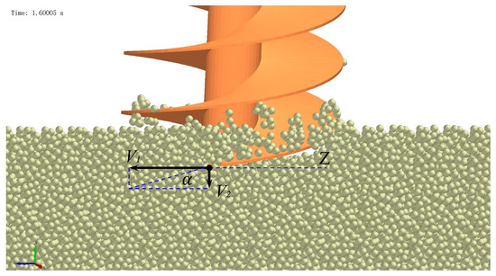 In order to obtain the working process of the auger on the slope, this study established the tilt soil bin model in the EDEM software, as shown in Figure 4. The effect of the auger’s geometric features and operating parameters on its performance was evaluated by simulating the operation of the bit in a virtual soil bin using the DEM. The virtual soil bin was filled with spherical particles, with a nominal radius of 7 mm, assembled to mimic a soil bed. To make the particle assembly in the virtual soil bin behave as closely as possible to real soil, input parameters were calibrated and validated, as detailed in references [21,22]. The DEM particles were packed to a bulk voidage of 33.3705%, which was measured for soil in the field. The input parameters used to describe the DEM particle and tool material properties are given in Table 2. Table 2 also lists the input parameters used to define soil–soil and soil–tool interactions. In the ANALYST software interface (EDEM V2.6), the state and load of the auger and soil can be directly derived. We set different colors for the “Grid Bin Group” according to the depth in the digging area; the purpose was to track the soil movement trajectory in each area. In the interface of EDEM, post-processing, we added a “Clipping plane” to show how the auger in the pit interacts with the soil and gain a schematic diagram.