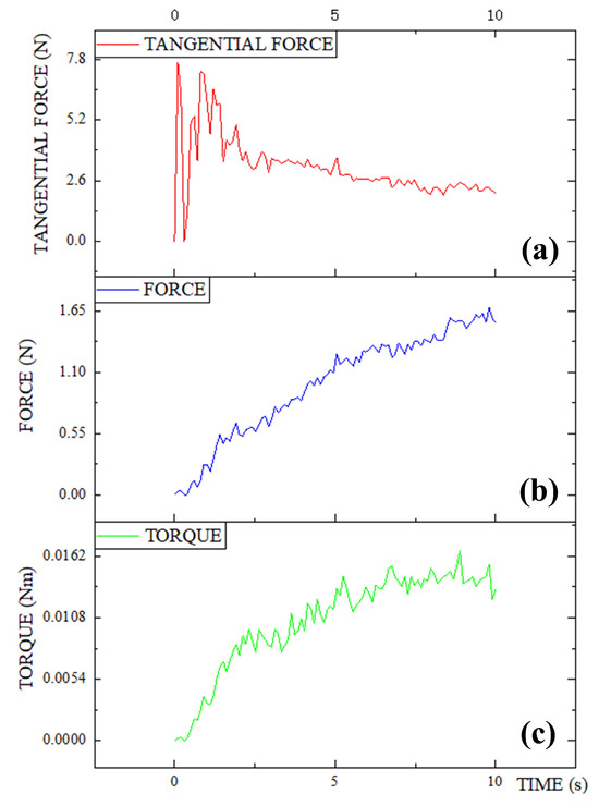 To validate the motion law depicted in the pictorial diagram, the load applied to the auger was exported to the software, as shown in Figure 8. The tangential force of contact exhibits significant fluctuations initially, followed by a trend towards stability. This phenomenon is attributed to the alternating contact between the auger and the soil during the slope-cutting process. As the feed distance increases, the torque and force experienced by the auger continue to increase. The rate of change decreases during the deep excavation process. The main reason is that the quality of the soil on the surface of the spiral blades continues to increase. However, due to the disappearance of the slope, the soil mass gradually stabilizes. The torque and force fluctuations observed in the auger can be attributed to two main factors. Firstly, the intermittent occurrence of clogging phenomena leads to random variations in torque and force. Secondly, an imbalance between the soil discharge and supply on the surface of the spiral blade also contributes to these fluctuations. This corresponds to the conclusions drawn from the theoretical analysis.