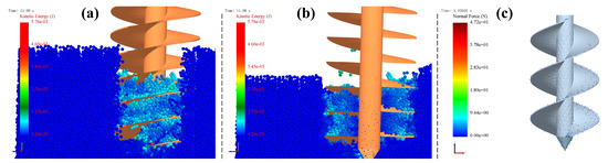 The influence of soil characteristics on the performance of machinery cannot be ignored [28,29]. The interaction between soils in the digging area was analyzed according to Equation (6). As shown in Figure 9a,b, the kinetic energy of the soil is affected by the disturbance of the spiral blade. By analyzing the color changes, it can be observed that the kinetic energy of the soil decreases along the spiral blades as it moves upward. The reason is the soil particle is in the middle, the front soil hinders its movement, while the subsequent soil promotes its movement. As shown in Figure 6b and Figure 9b,c, the soil at the edges of the blades has higher kinetic energy and moves outward from the pit first. Due to the action of centrifugal force, there is a tendency for the soil to move toward the edges of the helical blades. The amount of soil at the pit wall gradually increases. On the one hand, increasing the pressure between the soil and the helical blade surface contributes to the upward guidance of the helical blade surface. On the other hand, since the pit wall is relatively stationary, it hinders the downward sliding of the soil. However, with time, soil that does not move inward promptly can cause blockages. In contrast, the soil on the outer side, moving smoothly, is more conducive to upward movement.