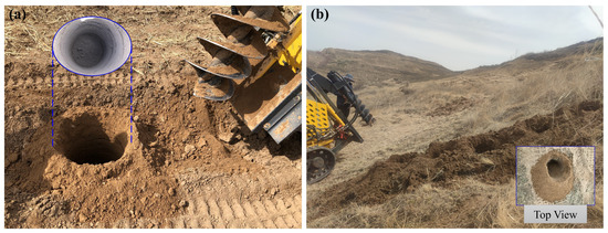 Operation diagram at the experiment site. (a) Effect diagram of plain ground digging. (b) Effect diagram of slope digging.