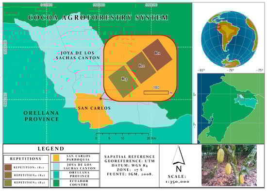The study was conducted at the Central Experimental Station of the Amazon (EECA) within the National Institute of Agricultural Research (INIAP). This is situated in the canton of La Joya de los Sachas, Orellana province, in the northern sector of the Ecuadorian Amazon region. The experimental site is located at 00°21′29.32″ S and 76°51′47.76″ W (Figure 1), at 250 masl. The climate is classified as humid subtropical, with abundant rainfall throughout the year: from 2700 to 3870 mm yr−1. The mean annual temperature is 25 ± 3 °C, which corresponds to the Köppen–Geiger climate classification of “Af” (humid tropical climate) [40]. The ecosystem type is the lowland evergreen forest of Aguarico–Putumayo–Caquetá [41]. The soil type is classified as Andean Dystrudepts, with 43% clay, 27% silt, and 30% sand [42]. The experimental site was slightly acidic (pH: 5.6) and had good drainage, an organic matter content of 4 to 6%, and a slope of <2% [43].