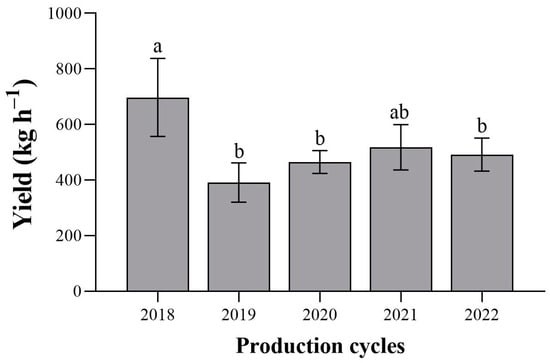 Mean values of dry cocoa yield in the different production cycles. Different letters indicate significant differences (p < 0.05) using a one-way ANOVA analysis followed by Tukey’s Test.