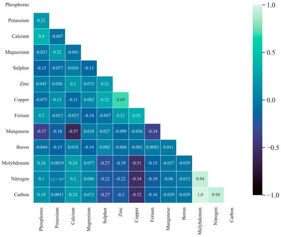 The analysis of soil nutrients revealed intricate correlations between different elements. A slightly negative correlation of −0.57 existed between Mn and Ca, indicating an inverse relationship. Cu also showed negative correlations of −0.51, −0.54, and −0.52 with Mo, N, and C, respectively. Additionally, there was a significant positive correlation of 0.69 between Zn and Cu, indicating a simultaneous increase in their levels. N also displayed strong positive correlations of 0.94 with both Mo and C. These results (Figure 3) provide valuable insights into the complex interactions of soil nutrients, offering information for agricultural practices to enhance soil health and fertility optimization.