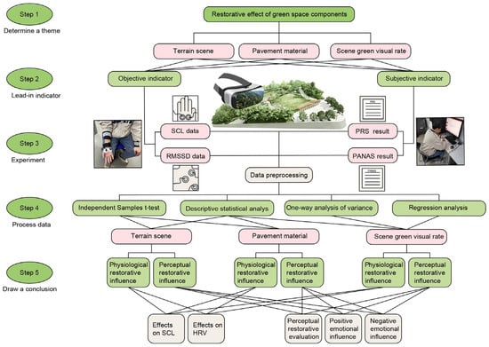First, according to our research theme, the experiment focused on three basic greenspace components, namely, terrain scene, pavement material, and scene green vision rate. The pressure recovery benefits were measured using both subjective and objective indicators. The experimental results were pre-processed and analysed using an independent sample t-test, descriptive statistical analysis, one-way analysis of variance, and regression analysis. Finally, the results are presented from both physiological and psychological perspectives. A technology roadmap is illustrated in Figure 1.