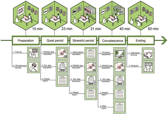 Experimental flowchart. The duration of the experiment was 50 min, divided into five periods, and the corresponding experimental content was displayed in each period vividly.