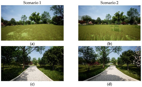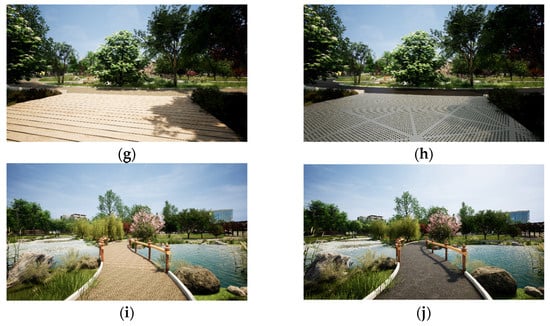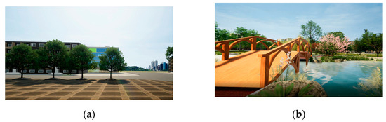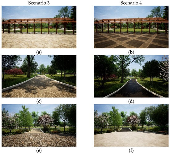 The experiment on terrain material compared Scenes 3 and 4, with the only difference being the paving material. The other factors in the scenes were kept constant. Scenario 3 used natural materials, such as marble, pebbles, granite, wood, and plain soil, while Scenario 4 used artificial materials, such as cement, asphalt, glass, steel, and concrete. Figure 4 shows the scenes of the experimental and control groups in the pavement material experiment.