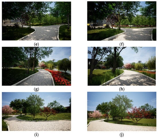 With the “restorative environment” concept, scholars have begun to study the impact of the natural environment or urban greenspace on different specific groups of people [,]. Some of these studies were specifically aimed at students [,]. The findings from a previous study investigating the utilisation of green areas among university students demonstrated that those who regularly visited greenspaces positively experienced a higher quality of life and an improved mood and perceived lower levels of stress. However, student barriers to greenspace use included insufficient time [,]. Studies have shown that virtual reality (VR) technology can have an effective restorative function at school or during workdays in the absence of a highly restorative natural environment. Exposure to nature through immersive VR enhances the connection to nature for individuals with limited inherent affinity [,,,,,,]; therefore, it is possible to replace the inconvenient actual environment with a convenient VR environment [,]. Moreover, VR has proven effective in assessing environmental restoration quality []. In recent years, with the development of VR technology, modelling scenes have become increasingly more realistic, and this level of realism affects emotional responses and perceptions, making it easier to control experimental variables []. Therefore, an increasing number of studies have focused on the use of VR technology in restorative environments. For example, Mattila studied the impact of VR forest environmental restoration by constructing an immersive VR forest [], while Wang constructed interactive VR scenarios to study the effects of restorative environments on anxiety and depression []. Additionally, some studies have been conducted on restorative environmental components []; for example, Huang and QY used VR technology to study the potential impact of different vegetation types and the influence of different types of trees, grass, and concrete environments on stress reduction []. However, the number of such studies is limited, and the available data are insufficient for practice []. Currently, most studies on restorative environments have focused on comparing the health benefits of greenspaces with those of other types of urban spaces [,,], whereas some studies have only examined the overall restorative benefits of greenspaces for population health [].