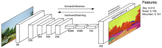 Input and output of the fully convolutional network. The image is converted from 3 channels to 96 channels in the first convolution layer, followed by 256 channels in the second layer, 384 channels in the third layer, and finally 150 channels in the last convolution layer, each corresponding to a different segmentation type.