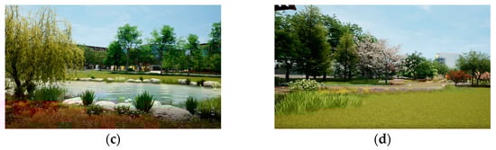 Obtained green vision rate was divided into four grades using the quartile method in scene green visual rate experiment, and partial representative scenes in each grade are displayed: (a) scene of lower green visual rate (<37%); (b) scene of low green visual rate (37%–42%); (c) scene of high green visual rate (42%–54%); (d) scene of higher green visual rate (>54%).