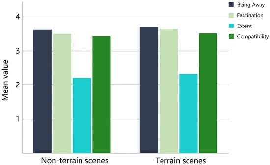 In addition, according to the analysis of each restorability feature dimension (Appendix A, Table A3), the terrain scene had the highest score in each dimension (3.39 ± 0.06), followed by the non-terrain scene (3.18 ± 0.07). The mean scores of the recovery characteristics for the different scenarios are shown in Figure 7.
