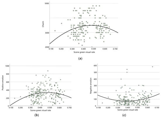 In addition, we used a regression analysis to conduct a four-dimensional analysis of the scene green vision rate perceptual restorative evaluation and found that the regression relationship between the green vision rate and distance, extensibility, and compatibility evaluation was not significant (p > 0.05), but the relationship was significant with charm regression (Appendix A, Table A11). The effect of the green vision rate on the attractiveness evaluation showed a nonlinear relationship. The green vision rate square term T-value was −2.938, p < 0.05, and R2 = 0.045 in the regression model, indicating a good prediction effect (F = 5.066, p = 0.007 < 0.05) (Appendix A, Table A11). In addition, the regression results of the influence of positive and negative emotions (Appendix A, Table A11) showed that the green vision rate correlated with positive and negative emotions, and the relationship was nonlinear. Therefore, the predictive effect of the model was good.