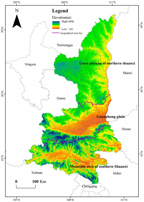 Shaanxi Province is located in the northwest of China (105°29′−111°15′ E, 31°42′−39°35′ N) and spans the Yangtze River and Yellow River basins. The terrain in the north and south is relatively higher than that in the middle, with an average elevation of 1127 m and a total area of 206 thousand km2 (Figure 2). Shaanxi Province is divided into three major regions including the Northern Shaanxi Plateau, the Guan Zhong Plain, and the Qinba Mountain Areas by Bai Mountains and the Qinling Mountains. The average annual temperature of Shaanxi Province is 11.6 °C, and the average annual precipitation is 653 mm [46]. Although most of Shaanxi Province experiences continental monsoon climate, the climate differences are obvious due to its terrain and latitude.