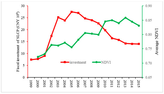 The relationship between fiscal investments of SLCP and average NDVI in Shaanxi Province from 1999 to 2015.