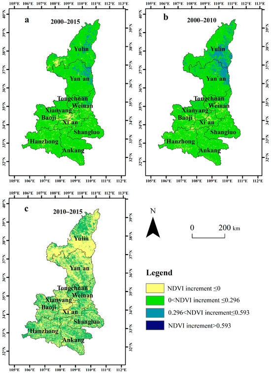 The changes in NDVI of Shaanxi Province. (a) The changes in NDVI of Shaanxi Province from 2000 to 2015, (b) The changes in NDVI of Shaanxi Province from 2000 to 2010, and (c) The changes in NDVI of Shaanxi Province from 2010 to 2015.