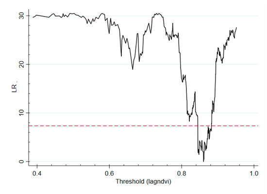 Finally, we identified the existence of a single threshold by the likelihood ratio (LR) test (Figure 5). The LR intersects the red dotted line, indicating that a single threshold is significant at the significance level of 95%. We could infer that a single threshold estimator is close to the real one.