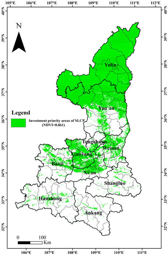 We further used an NDVI value of 0.861 to recognize the investment priority areas of Shaanxi Province (Figure 6). The priority area of fiscal investments was mainly distributed in most of the Yellow River Basin and the narrow and long valley of the Yangtze River Basin with a total area of 90,239 km2, accounting for 43.89% of the total area of Shaanxi Province. The sub-optimal investment areas of SLCP were mainly distributed in most areas of the Yangtze River Basin and the central and southern regions of Yan’an City, with a total area of 115,363 km2 accounting for 56.11% of the total area of the whole province.