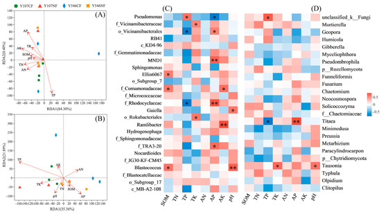 3.6. Correlation Analysis of Soil Indices and Microbial Composition