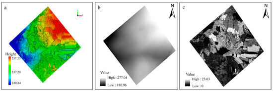 The original 3D point cloud (a), DTM (b) and CHM (c) of the study area.