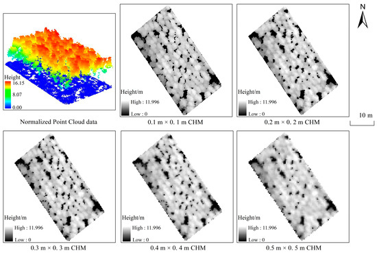The normalized point cloud data and the CHMs with five spatial resolutions (0.1 m, 0.2 m, 0.3 m, 0.4 m and 0.5 m) were generated from the segmentation algorithms performed based on these two datasets (Figure 4). As the spatial resolution of CHM decreases, the surface details of CHM are gradually ignored. When the spatial resolution of CHM is 0.2 m × 0.2 m, it can not only fill the tiny holes on the surface of the canopy, but also display the contour among the canopy clearly. Furthermore, the brightness value among the canopy gap is obviously reduced, which enhances the canopy information and improves the precision of single-tree segmentation.